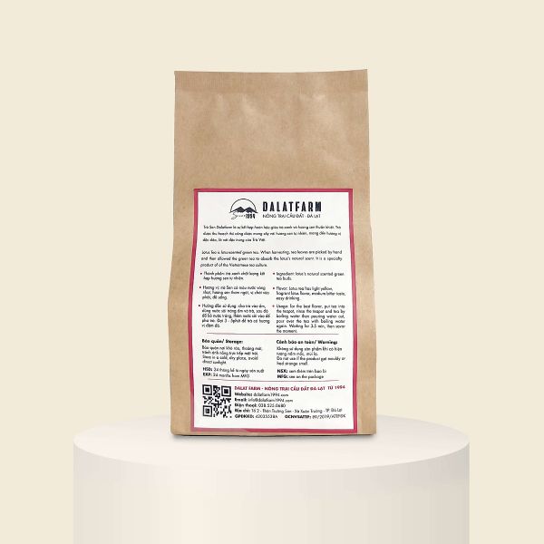 • 100% Trà Sen Dalatfarm được thu hái thủ công, tuyển chọn những búp chè tươi 1 tôm 3 lá. Trà được sao nhiều lần giúp cho lá trà thẩm thấu toàn bộ hương sen, khi pha tạo nên cảm giác khoan khoái và thư giãn.